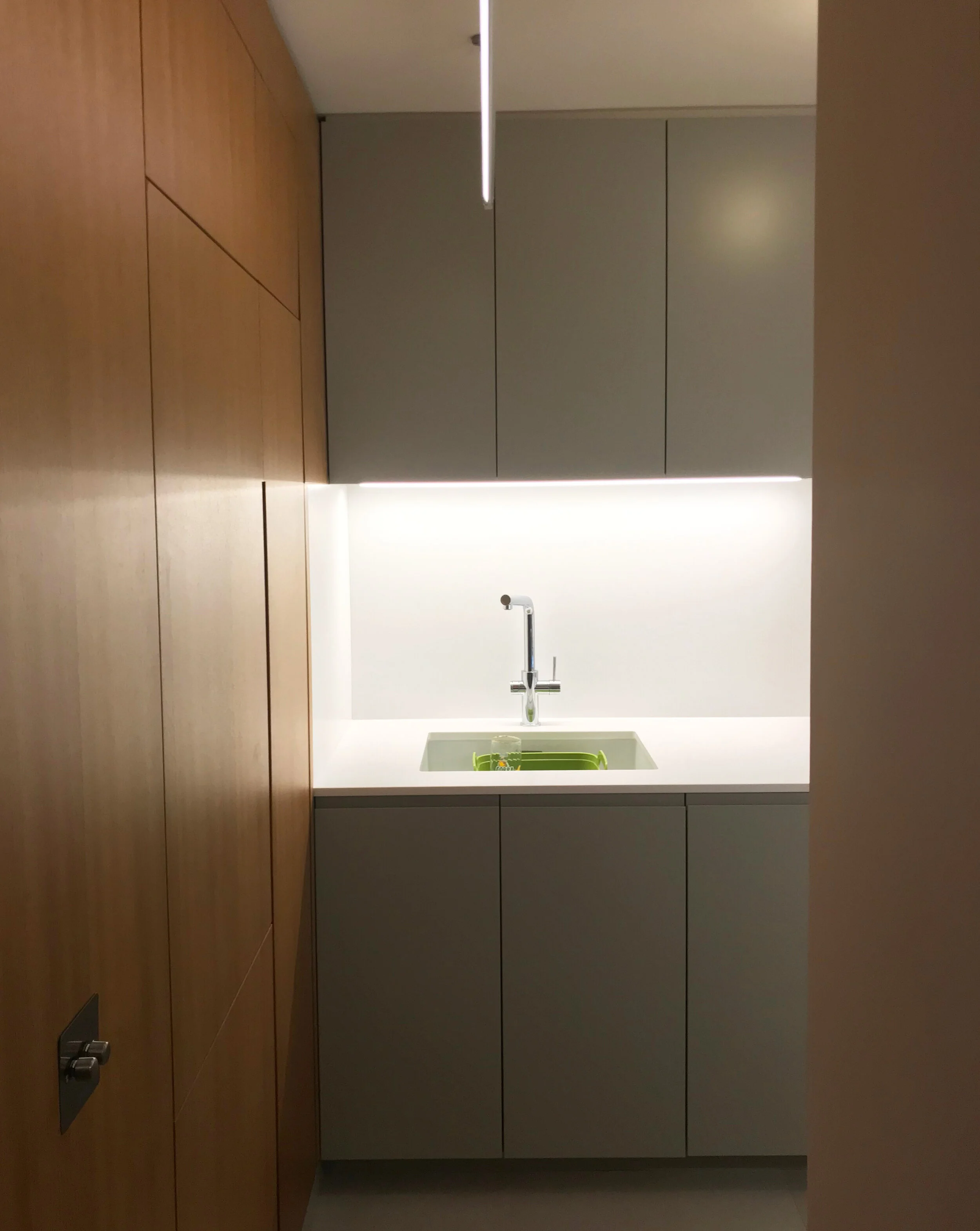 The new kitchen finishes include wood veneer paneling and white solid surface worktops.