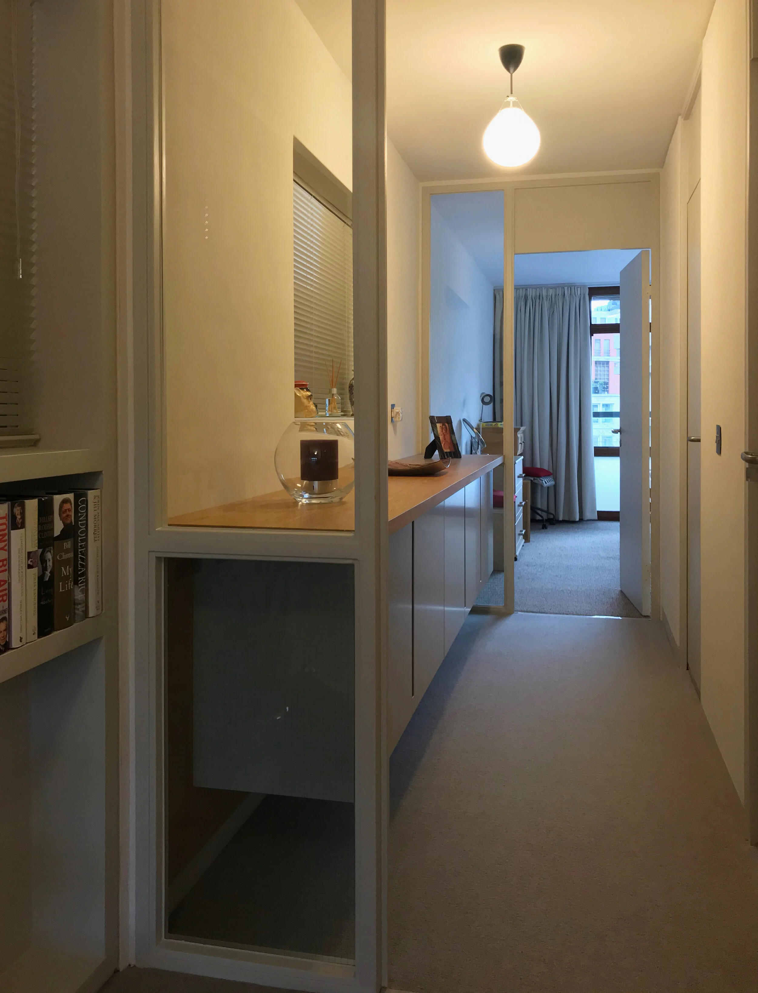 The existing lounge sliding door was replaced with a folding-sliding door set into a pocket in the wall when not in use resolves the problem of the original door obstructing the adjacent wall cupboards. The guest cloaks was transformed to an utility room for the washer dryer and the toilet moved to the bathroom. Hallway storage furniture is hung from the wall without obstructing the glass of the existing door + screens, preserving the transparency of the original Barbican design.