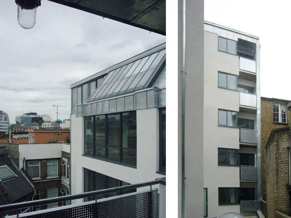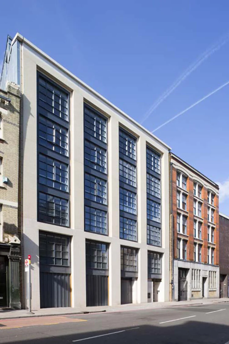 Rozeman Architect cooperated with Greig Ling on this new build mixed use development on a WWII bomb site on Curtain Road comprising 600m2 retail unit in basement and ground floors and 18 live/work units over. The in-situ reinforced concrete frame supports precast floors that were left exposed in the final construction. The facade was white glazed brick faced precast units fabricated off site and erected in a few days.